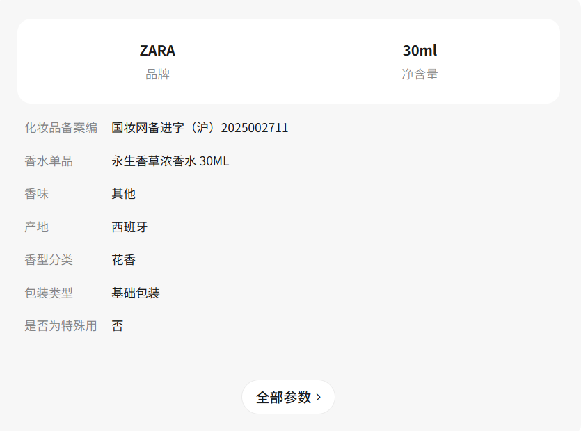 ZARA新款 女士 永生香草濃香水 30ML 0110720 999